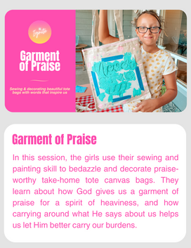 We have 12 sessions every Fall and Spring that run for 3-hours each. Every session is unique and is packed with out-of-the-box games, fun activities, team challenges and Christ-centered discussions with lots of questions designed to help the girls discover their God-given personality and identity, grow in confidence and spiritual authority, and learn how to create deep and authentic relationships with others.
